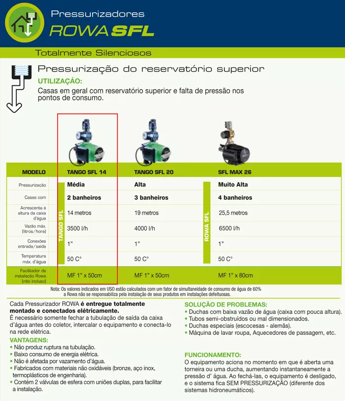 O Pressurizador Tango SFL 14 é usado para aumento de pressão de água em residências em geral, novas ou antigas.